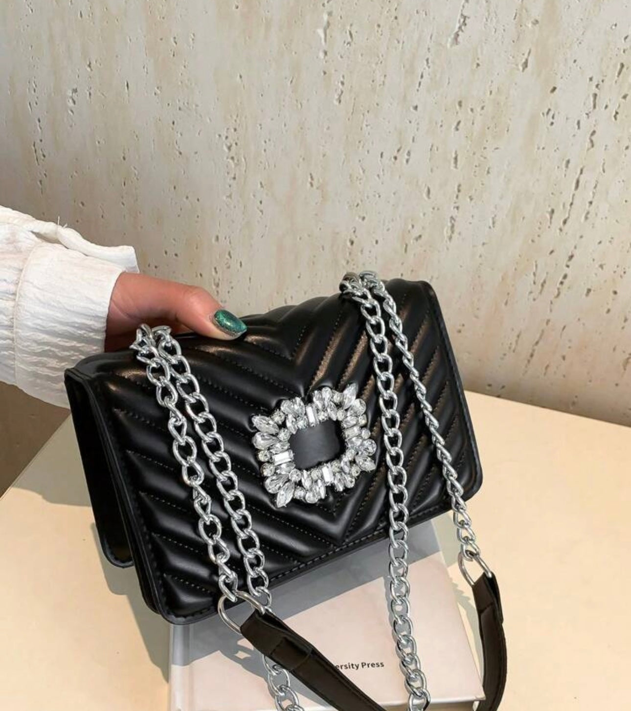 Ce sac à main bandoulière en chaîne argentée est un accessoire moderne et raffiné, idéal pour celles qui recherchent à la fois élégance et praticité.